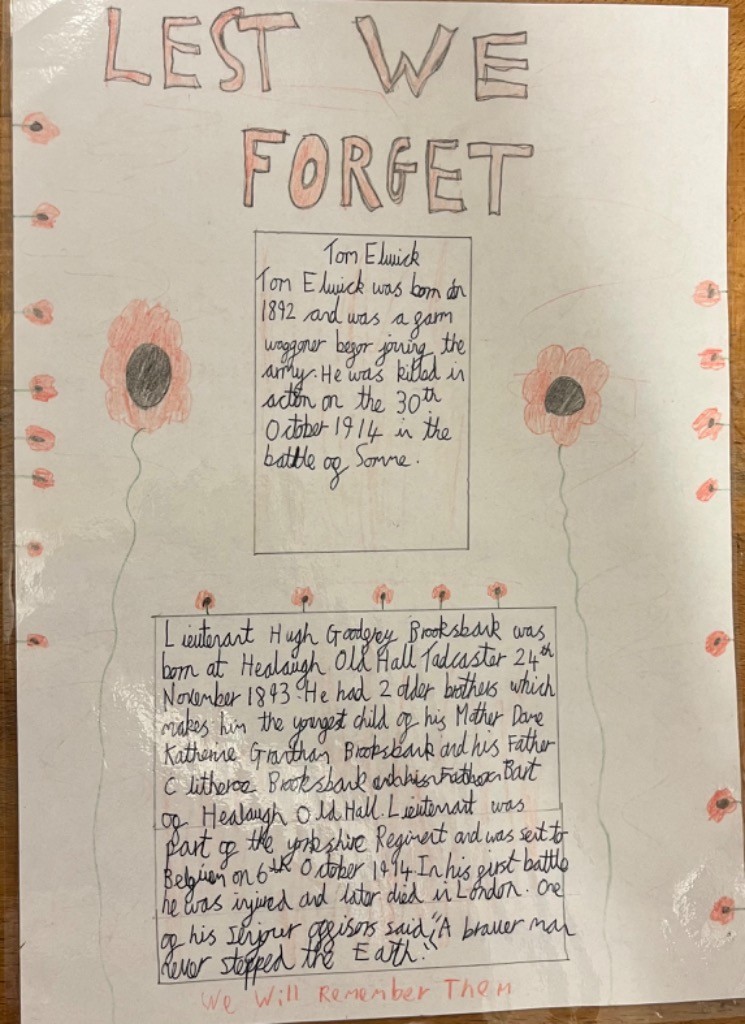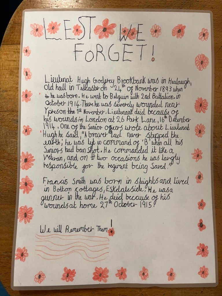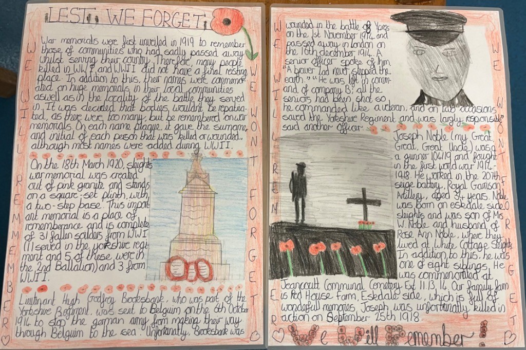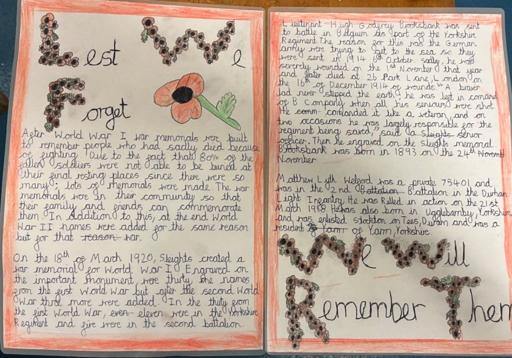 This week, to mark Remembrance Day, Leaders have been exploring Sleights war memorial and the people commemorated on it. They have created thoughtful pieces of work around this, which will be displayed around the memorial and village this weekend. We were also joined by Mr Hann, a former Royal Air Force Wing Commander (Retired). Mr Hann worked with Leaders to explore some of his own stories and reflections on his time serving. Mr Hann shared with the children some of his first-hand experiences and brought some of his equipment and uniform into school. The children were really engaged to also see photographs and medals from Mr Hann’s service. The children had so many questions and made some excellent contributions.