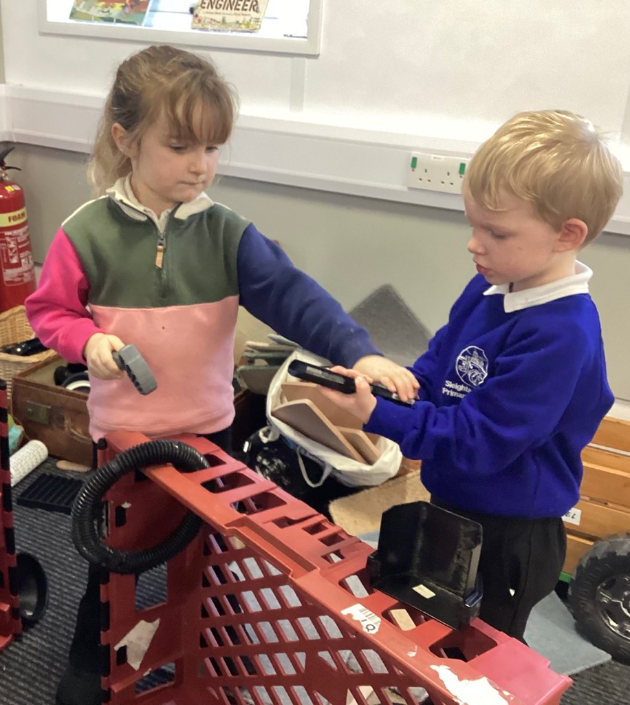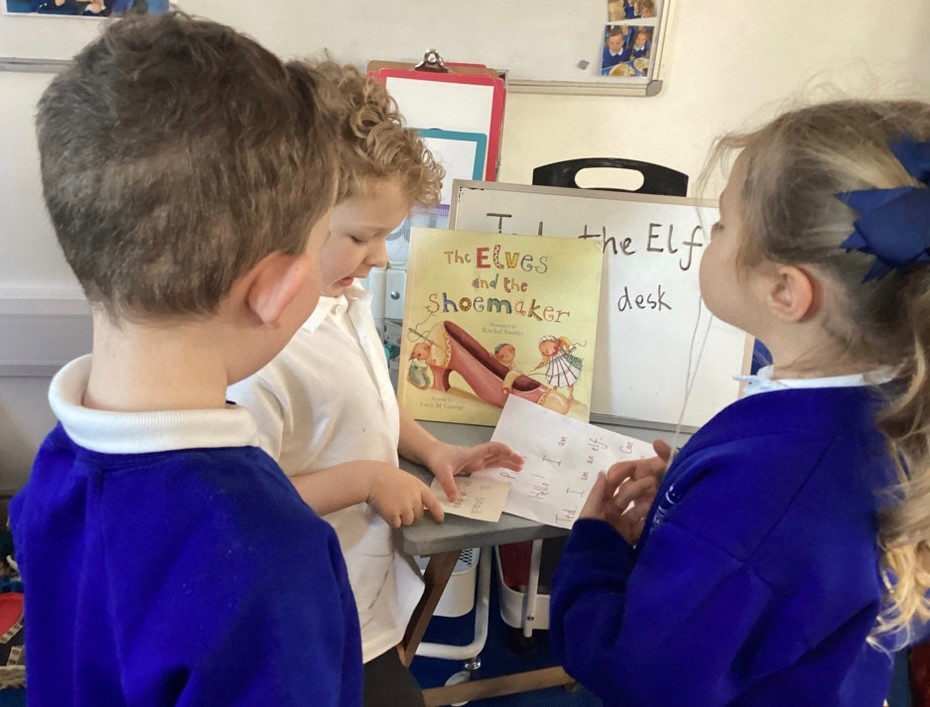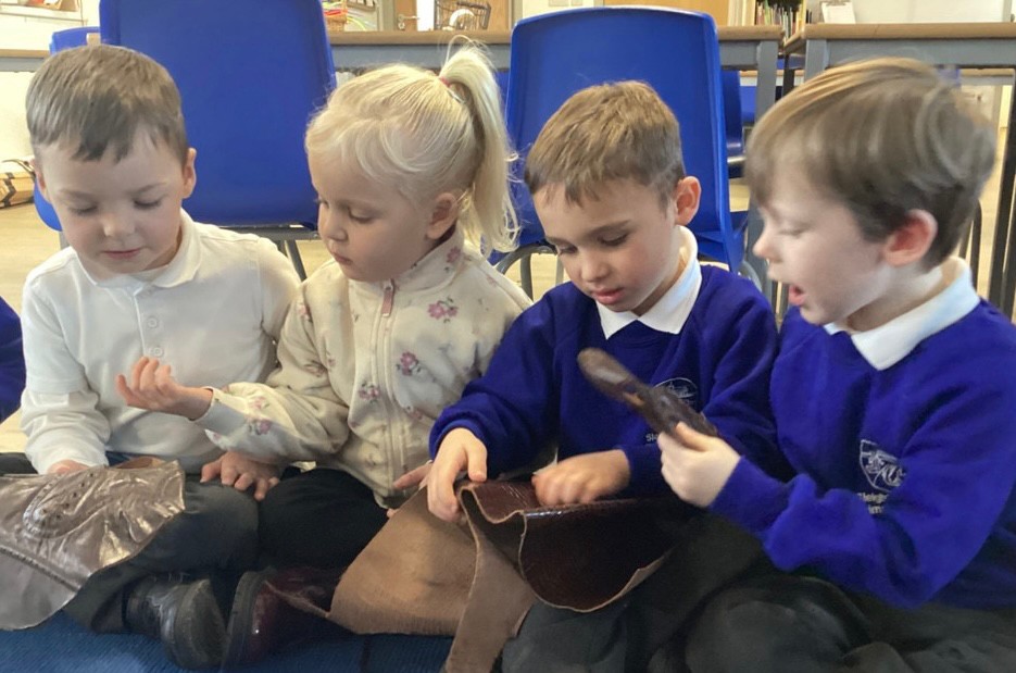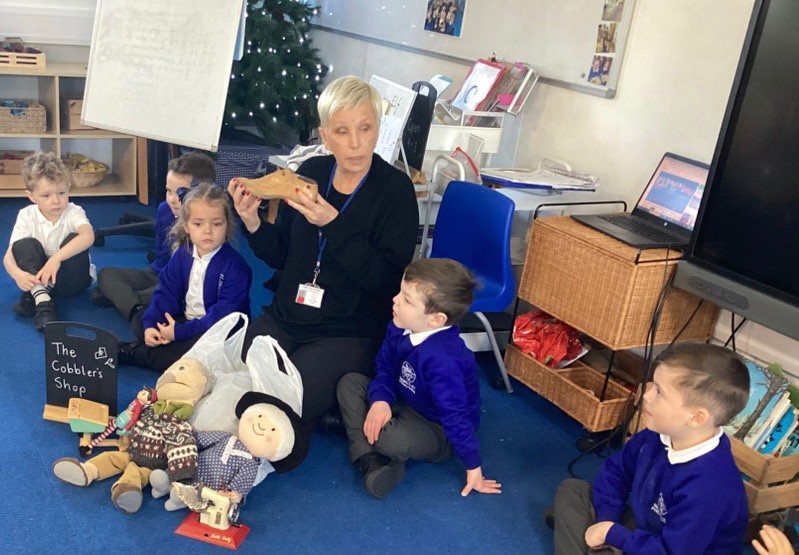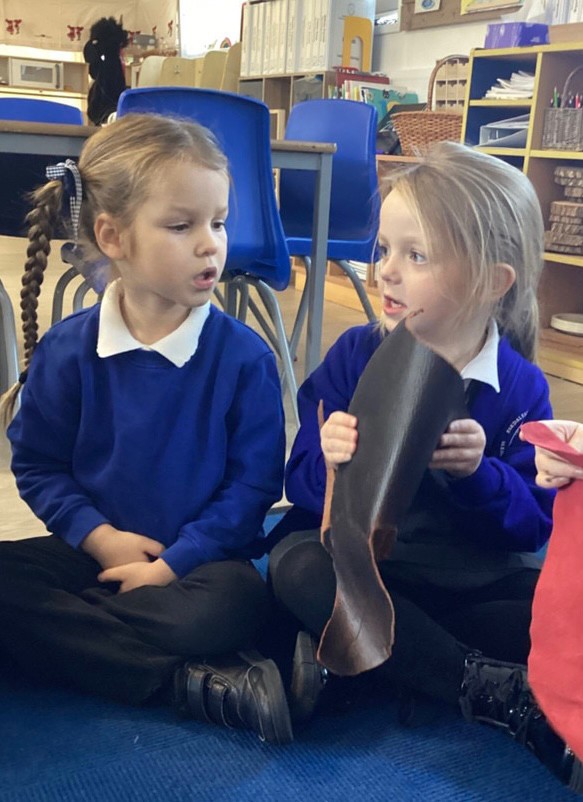 We begin this week by reading a traditional tale, The Elves and the Shoemaker.An elf arrived in the classroom and he left us a letter to read. He was there to help the little old man who made shoes in the shop. The Pioneers handled artefacts from the past, examining shoe lasts, leather and old part made shoes. They took a close look at a very old sewing machine and noticed the levers and the cogs that make it work. We discussed manmade and natural materials, learning where the leather comes from and the tools required in the workshop. We discussed where the shop was and what it was like to live in a flat. The work gave us so many new words to use in our play in the Cobbler’s Shop.