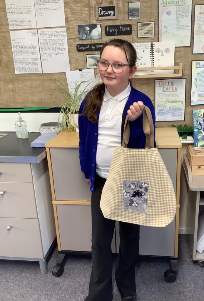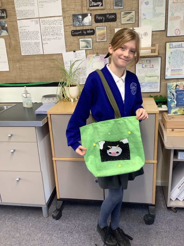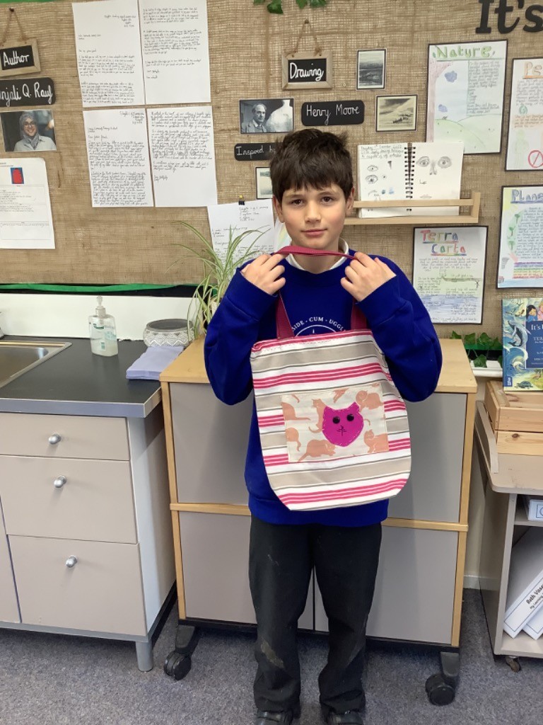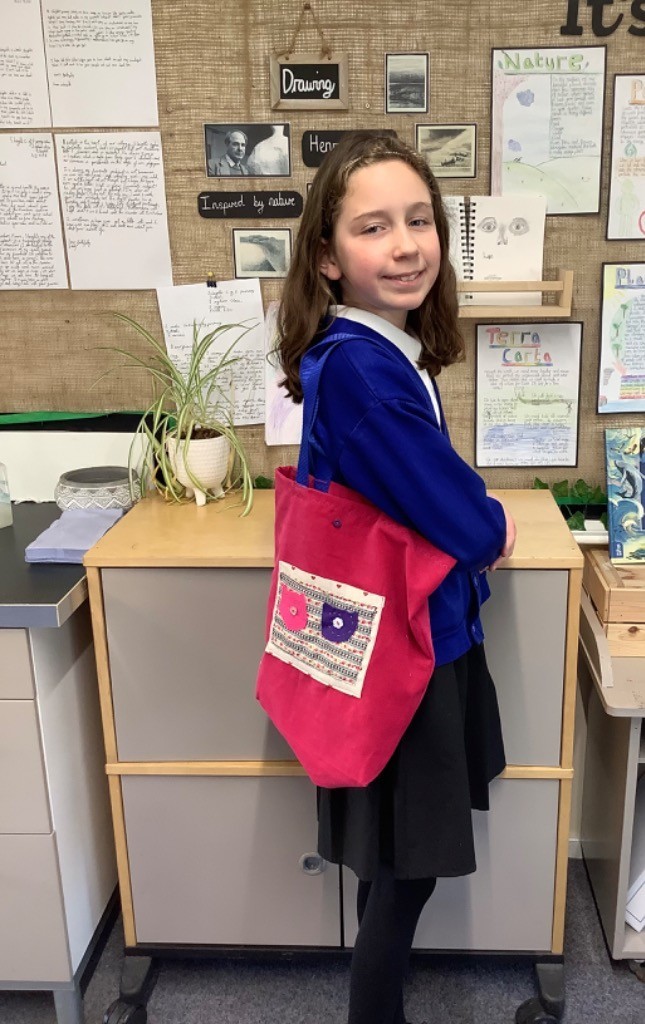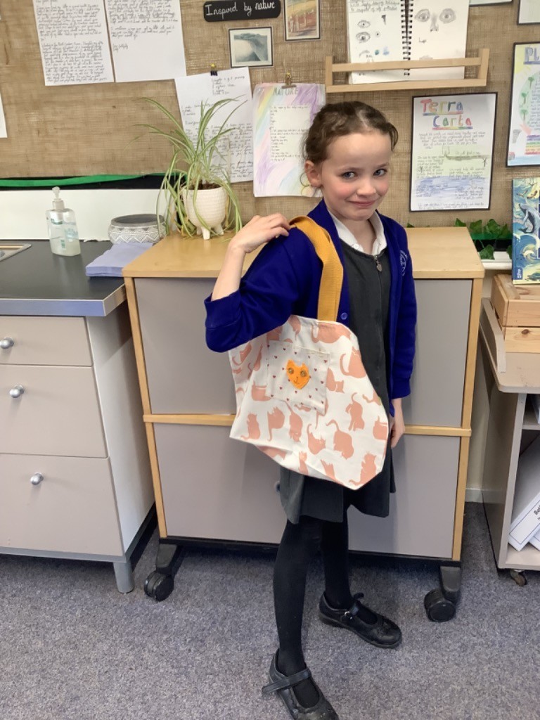 In DT, the children have designed and created their own bags. They have used templates, cut fabric and used pins to secure it onto another piece of material. To complete their bags, Leaders used both hand-stitching and a sewing machine. The finished bags looks incredible!
