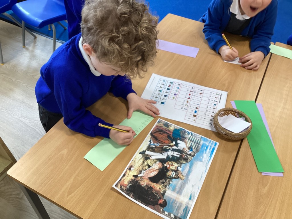 Using an array of materials, tools and locations, the Pioneers built their traps and vehicles. They used saws, hammers and screwdrivers. They discussed the properties of the materials used and why they were the right choice for the job. We built inside and outside, reviewed our plans and drew annotated diagrams. The Pioneers are now adventurous in their writing, choosing to add adjective and using the Grapheme Mat to support composition. Some wrote dominoes and even Lamborghini!.