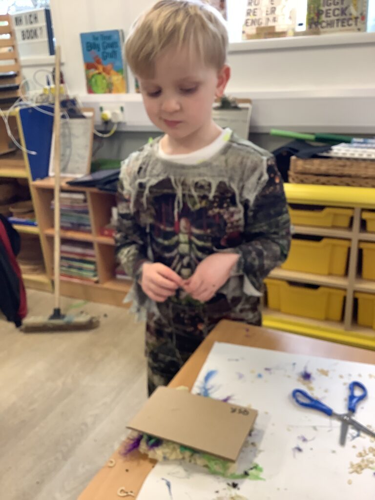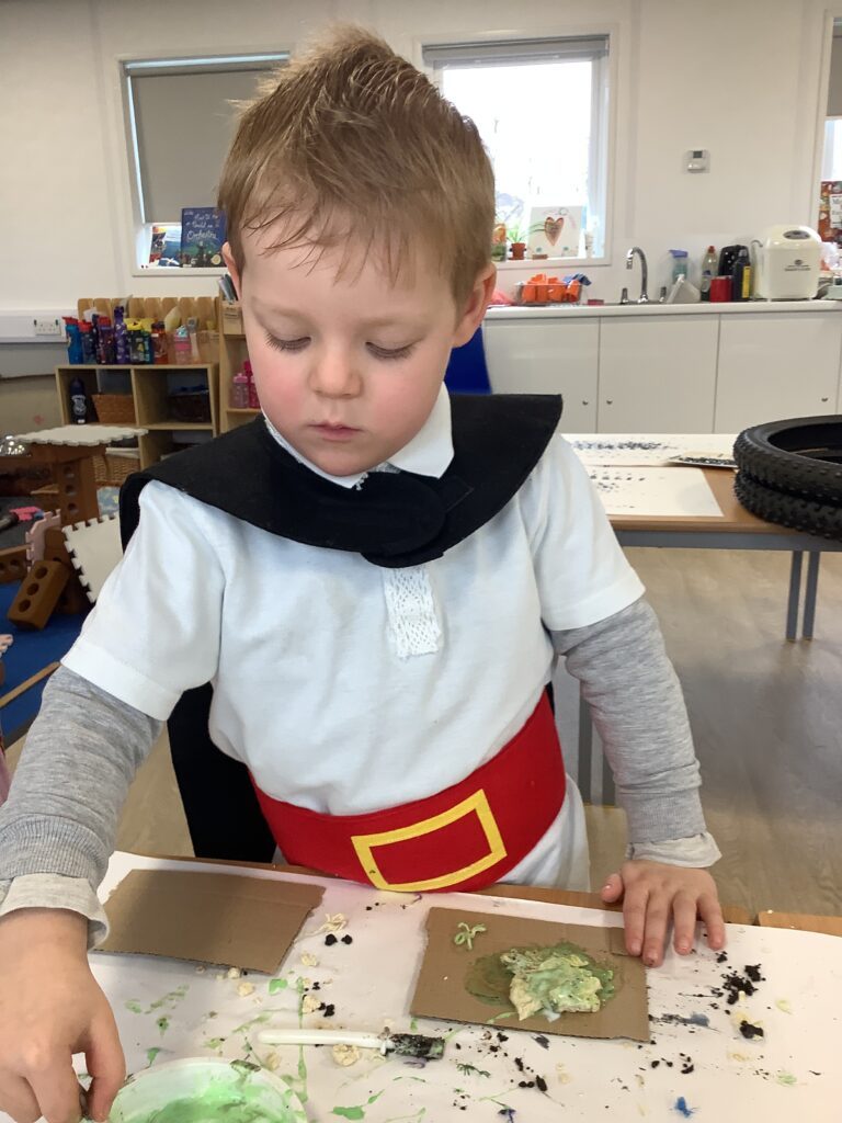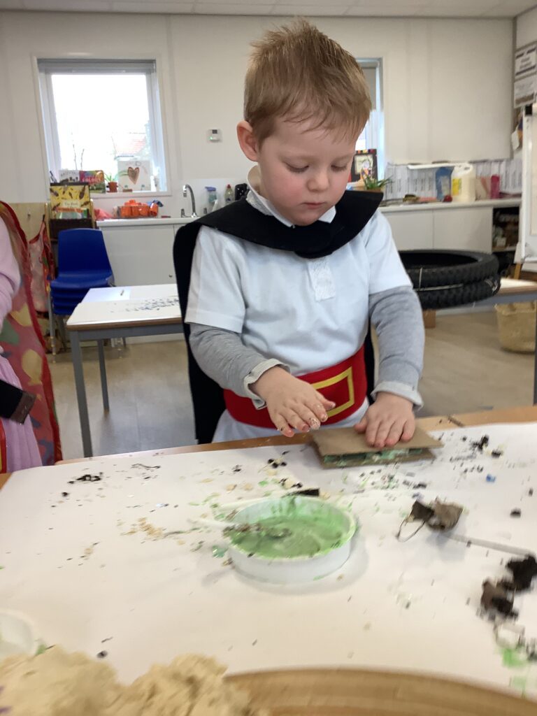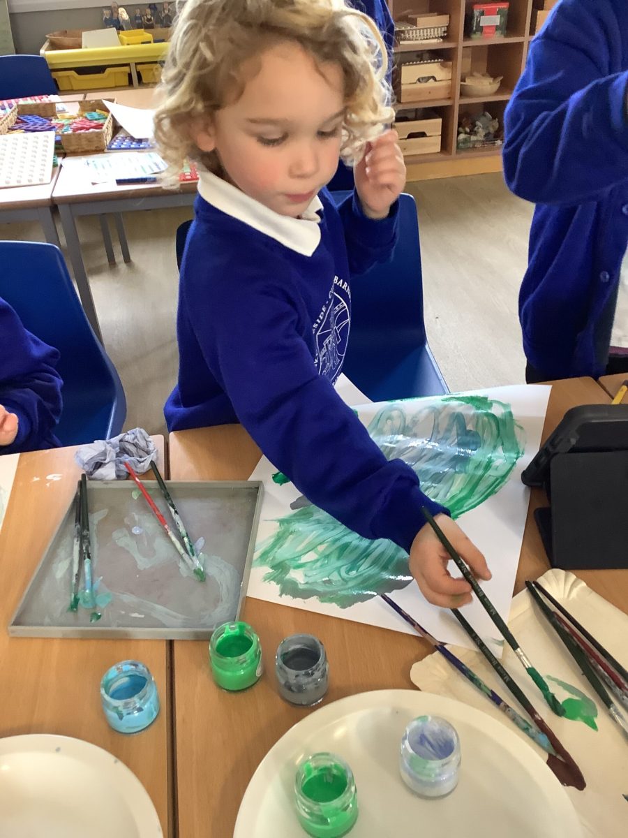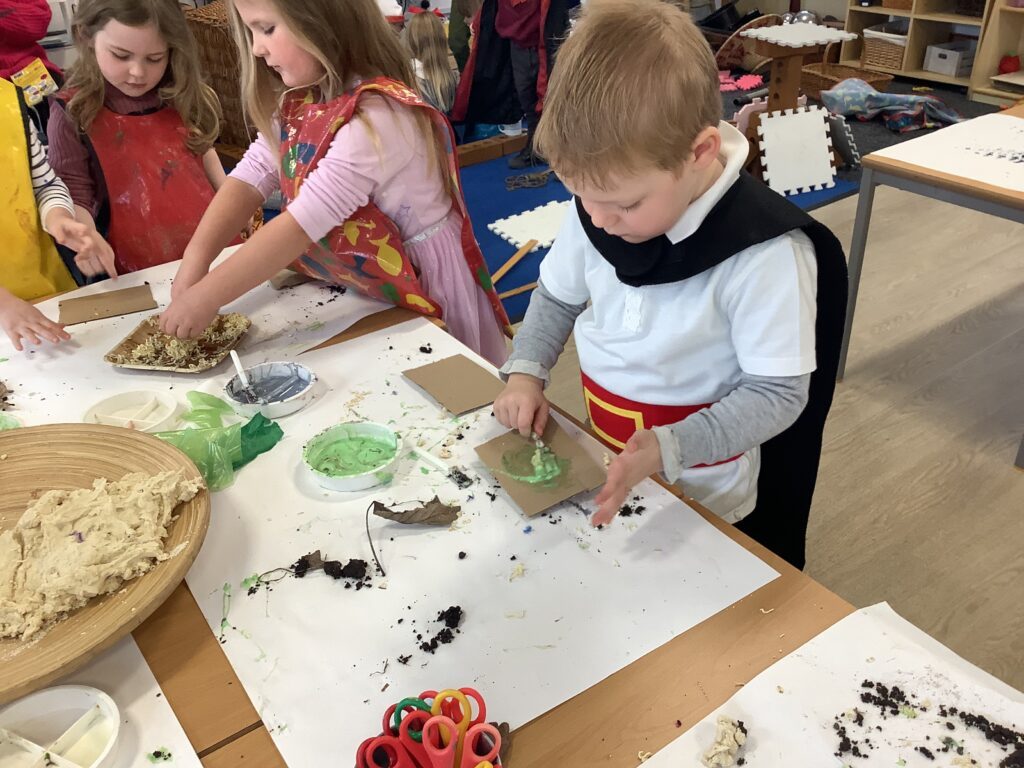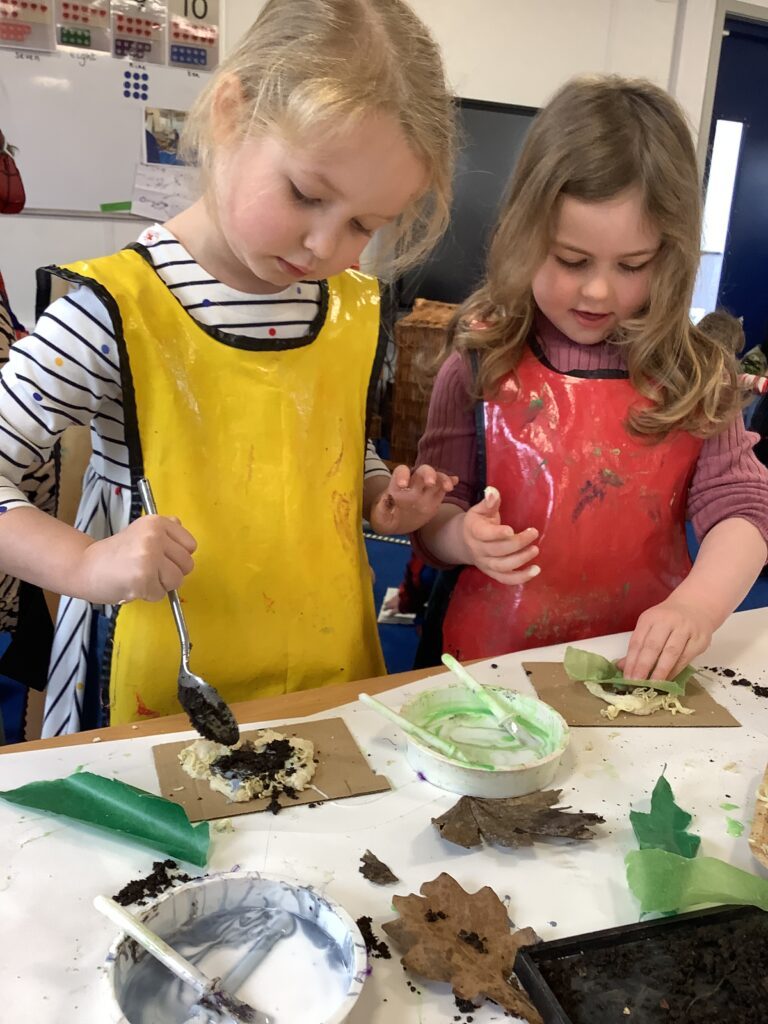 On Wednesday, we braved the forest. Dodging the drizzle, we made it down there and collected leaves and sticks to print with in art later in the week. The forest was muddy, but we were dressed accordingly and moved around sensibly!