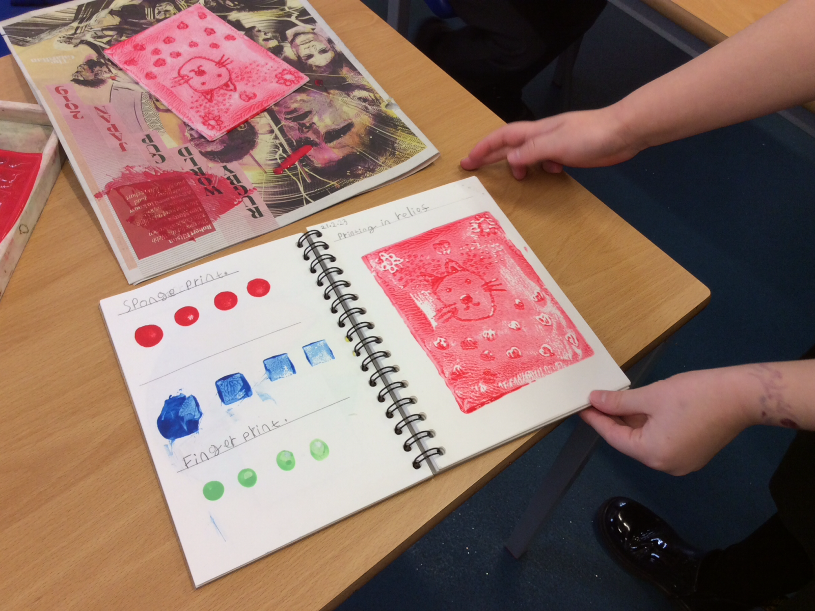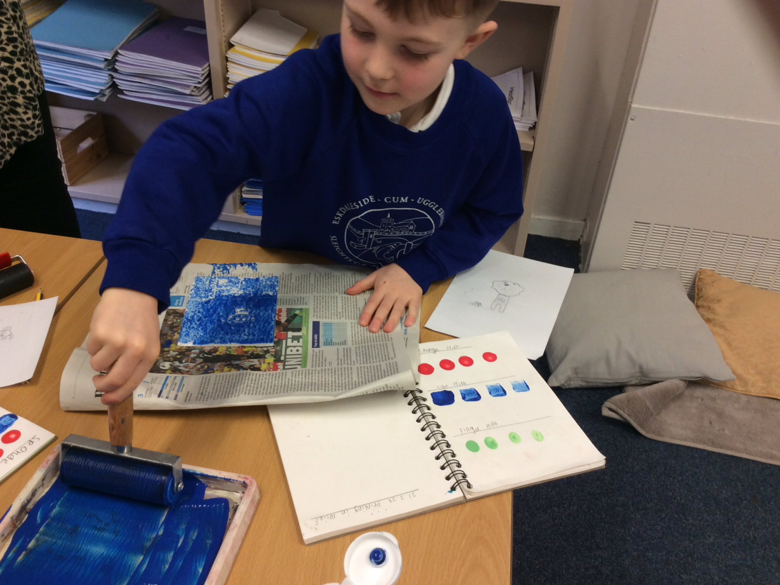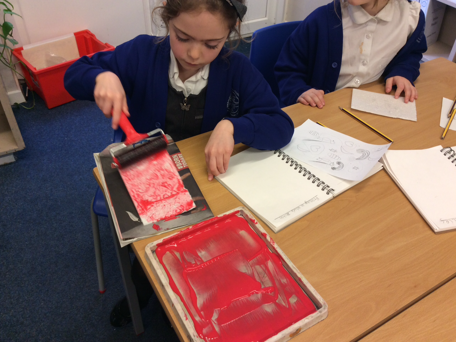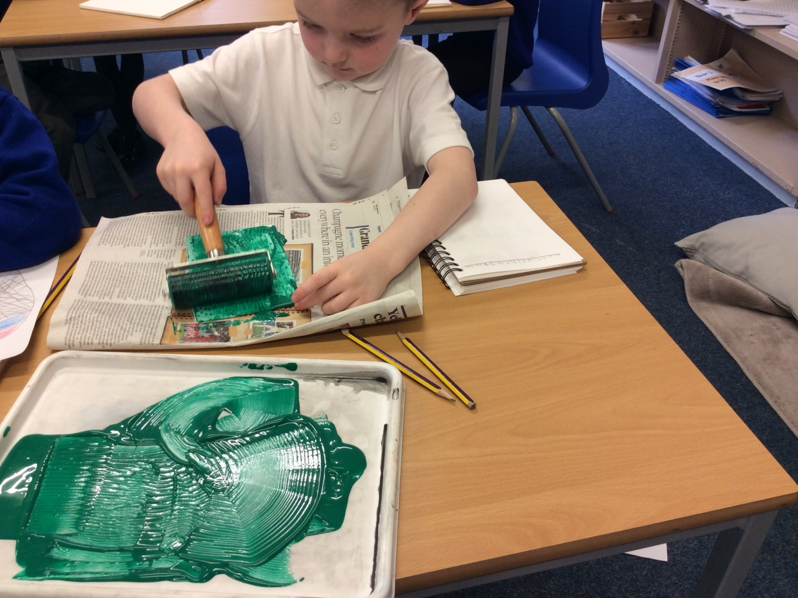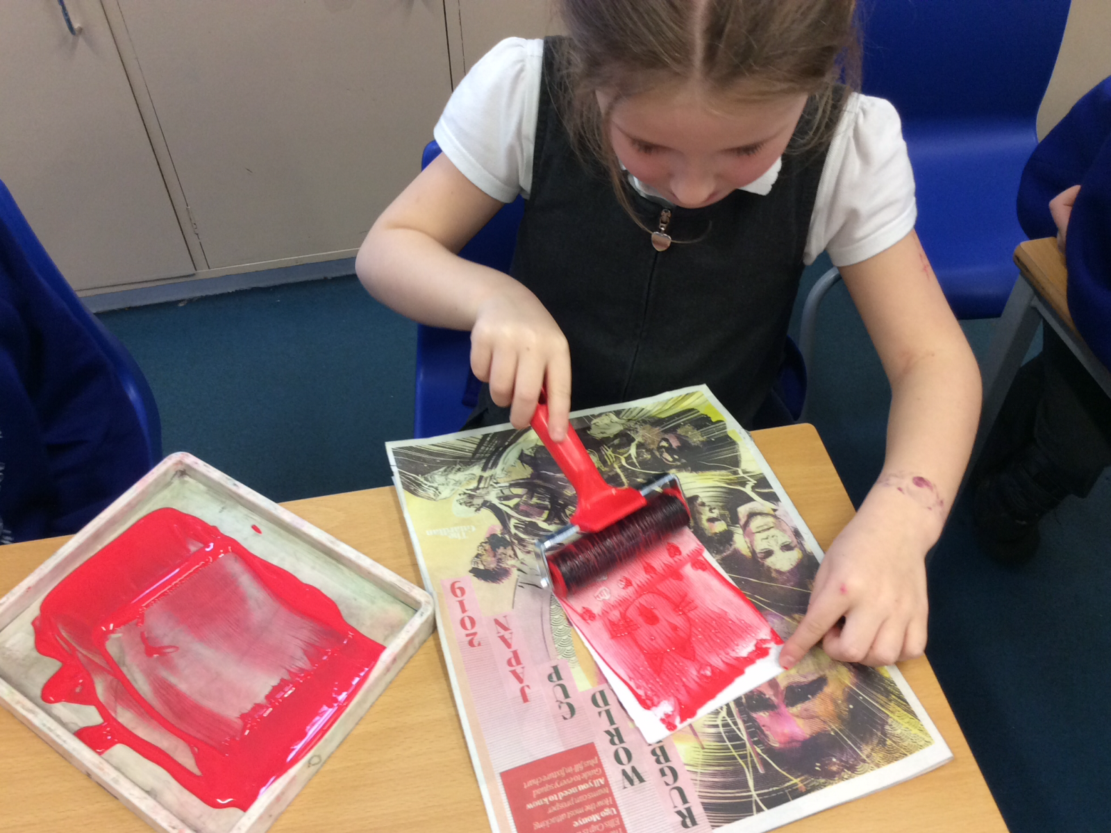On Monday, we explored printing in relief in Art. We drew our design on paper first, then etched our design onto a polystyrene tile. Using a roller we applied paint and printed onto our sketch books. We were amazed and excited to see the results.