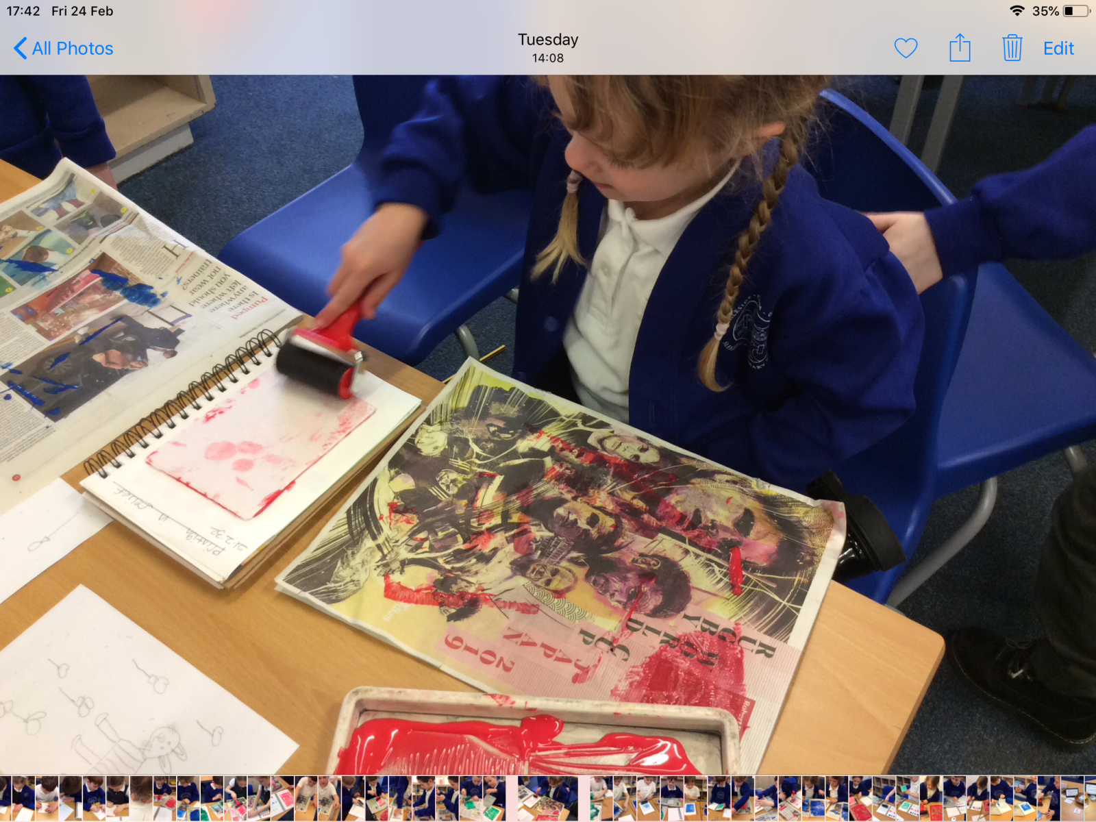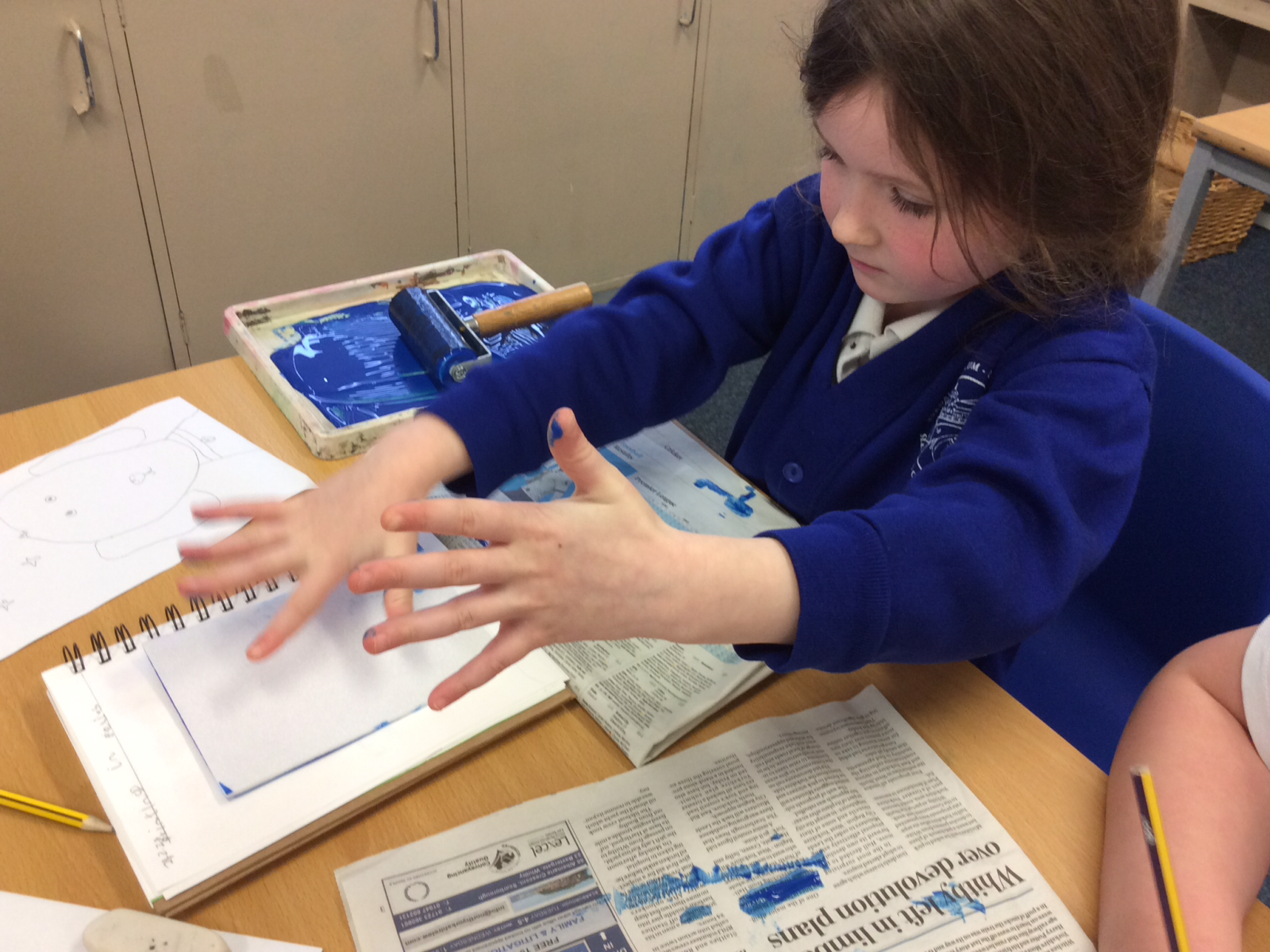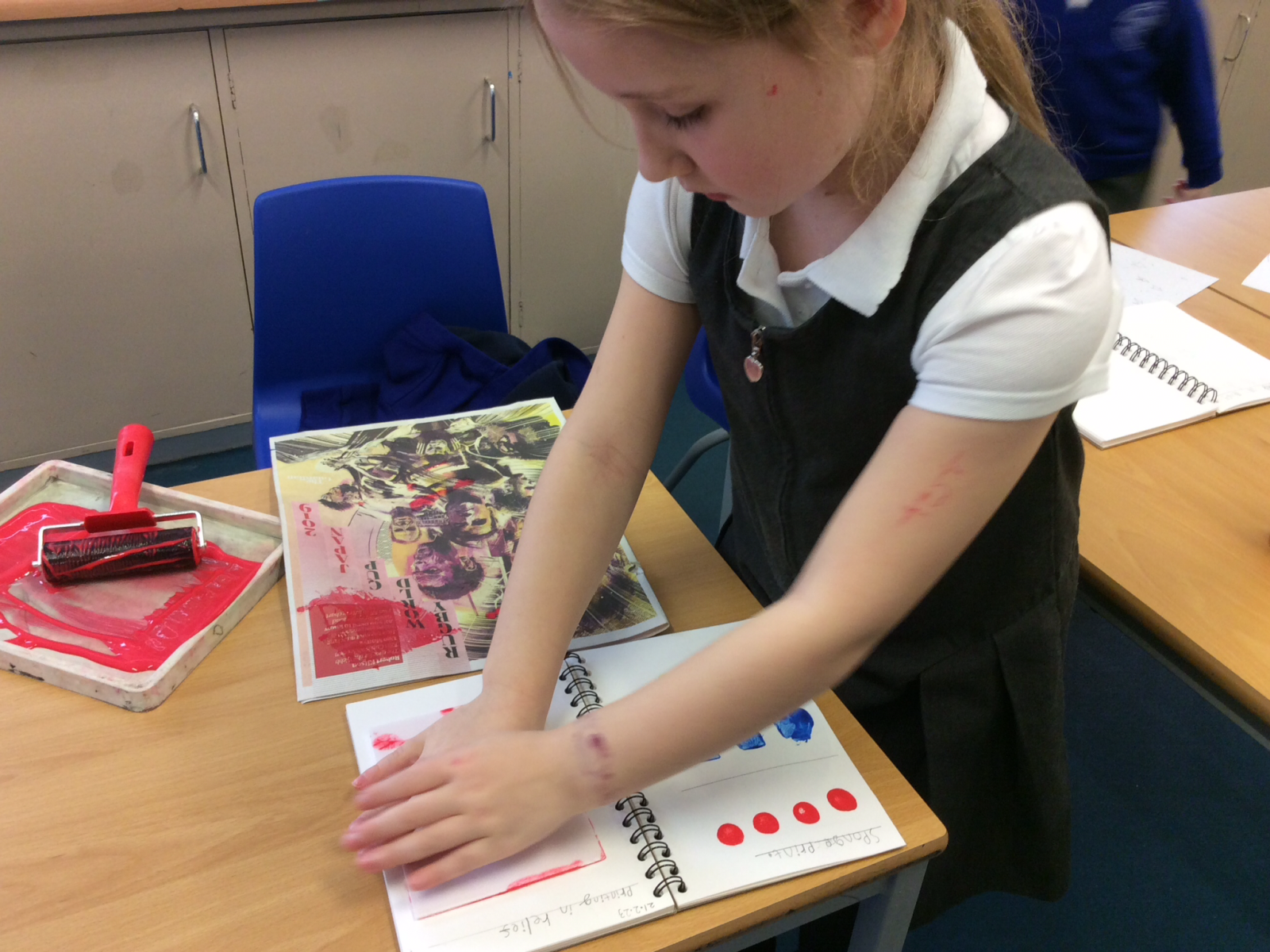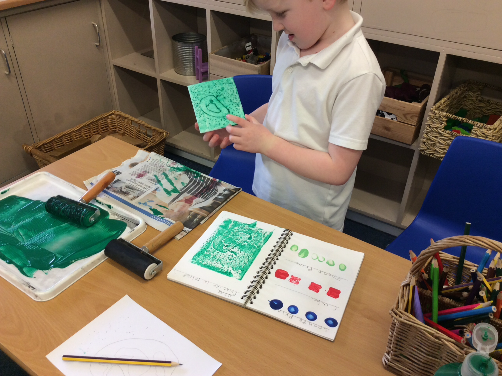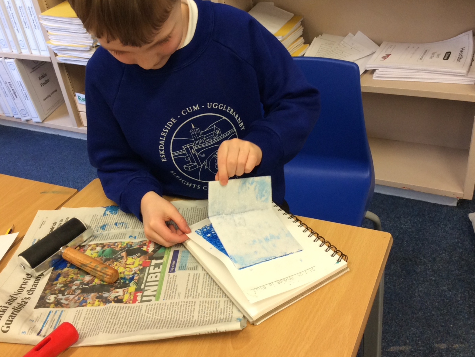 On Monday, we explored printing in relief in Art. We drew our design on paper first, then etched our design onto a polystyrene tile. Using a roller we applied paint and printed onto our sketch books. We were amazed and excited to see the results.