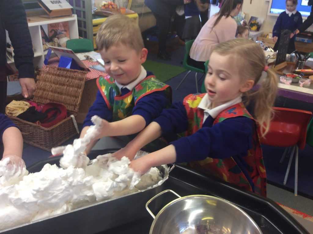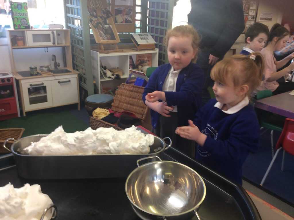 The addition of flour and water made the compost much stickier and the children experimented with the consistency. They were very restrained when helping themselves to their required ingredients. They helped each other and at one point I heard a little voice say,”We are a team.”