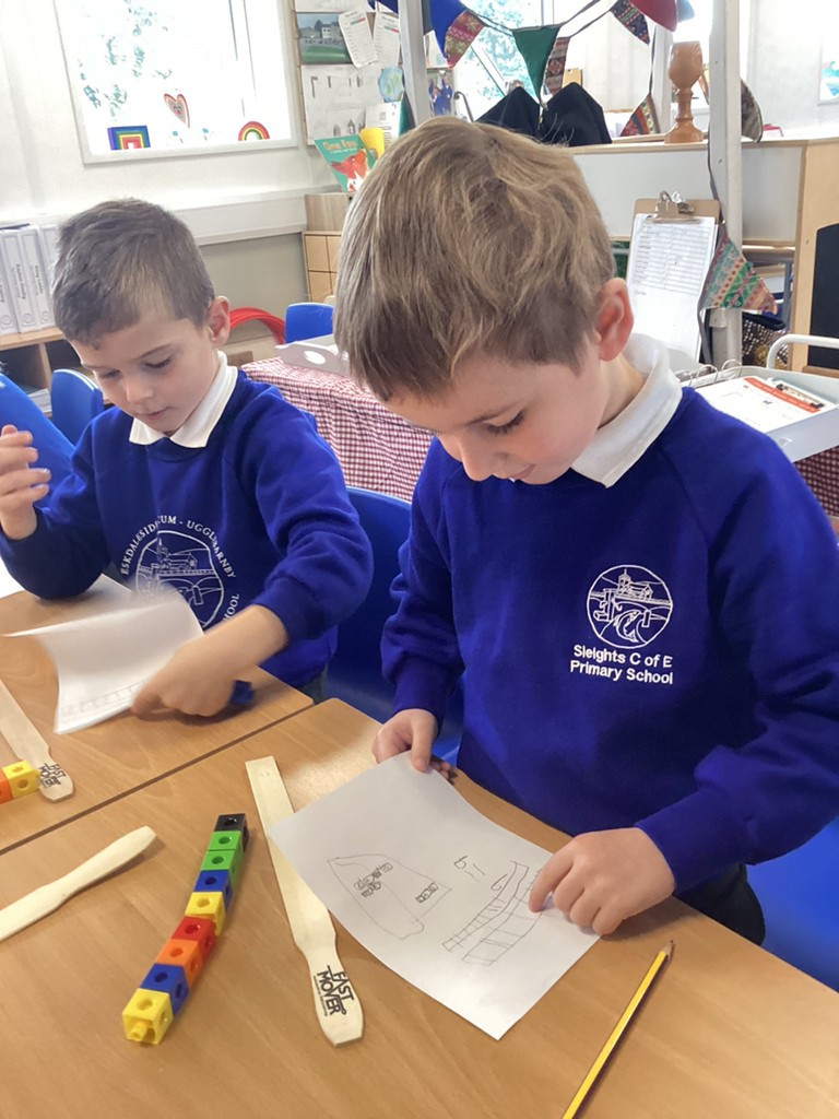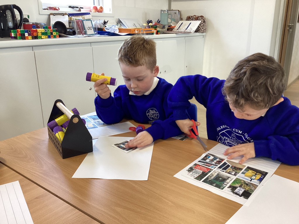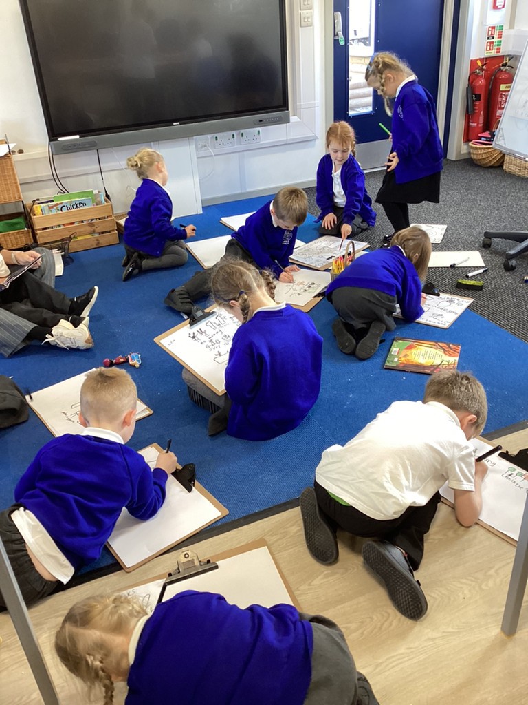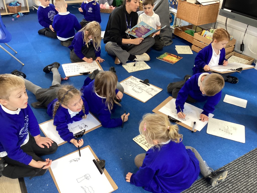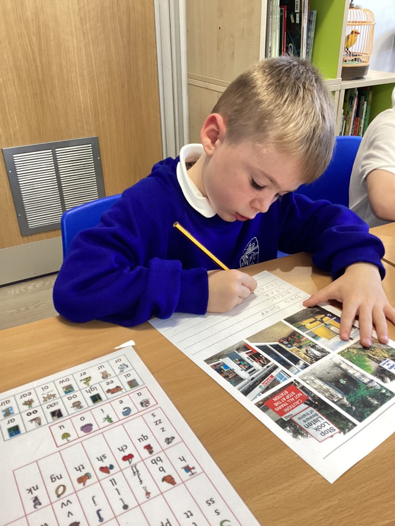 We read our story about Sid in Sleights, identifying locations in our village and describing these. Sid visited the bus stop. The bus stop is opposite Botham’s. We spotted road signs and lots of letters on shop signs. We had some great chat about the telephone box and how things had changed over time!