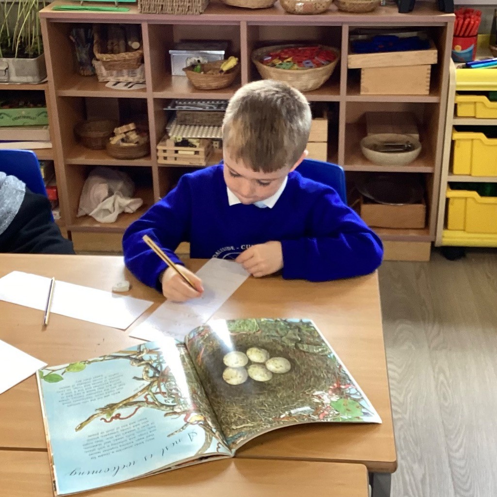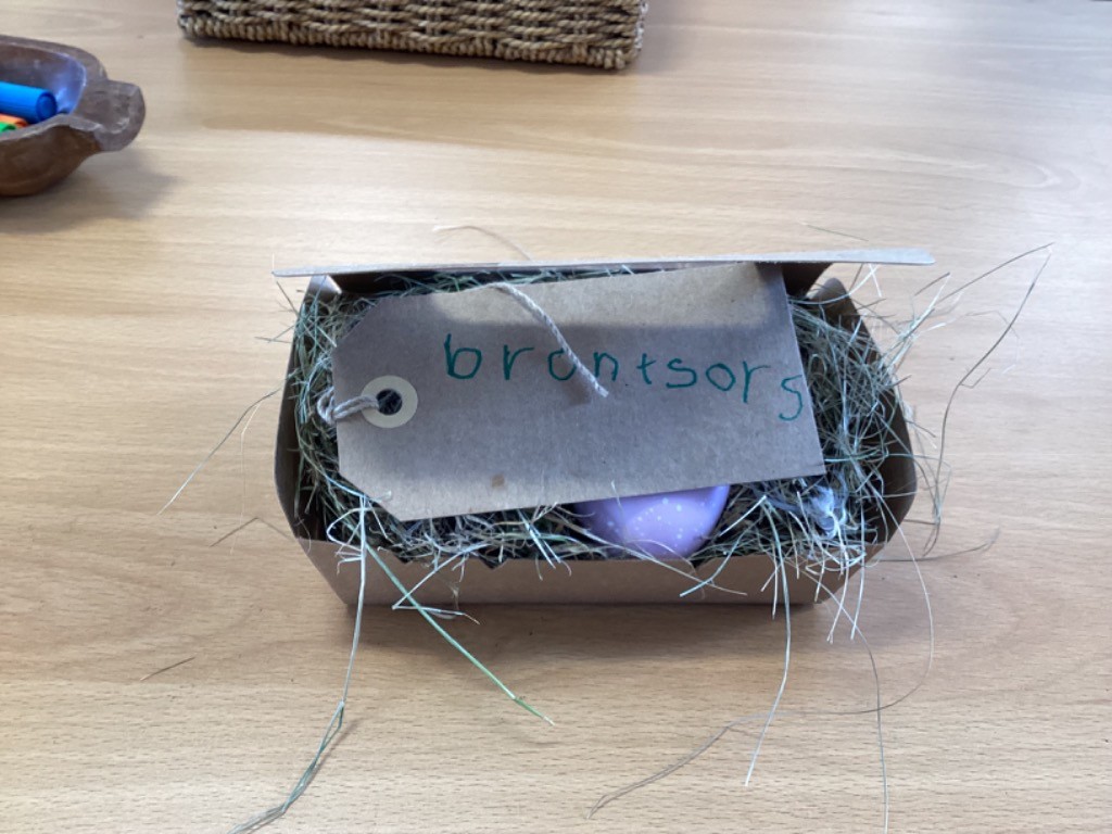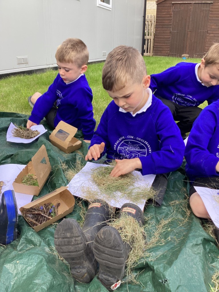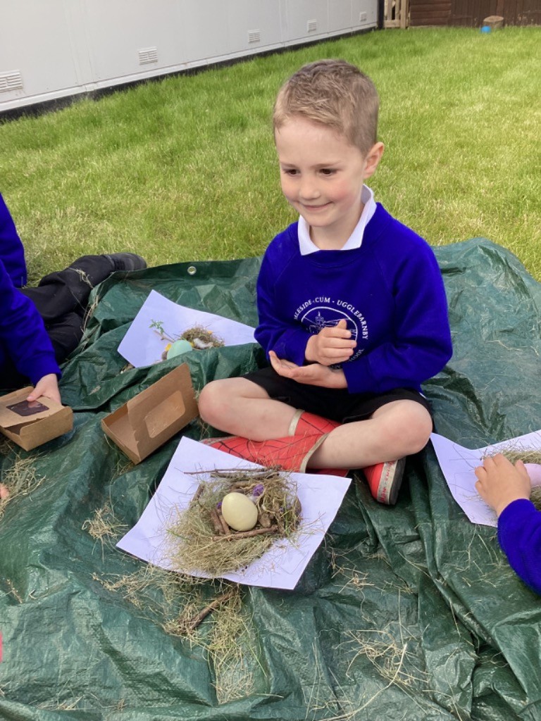 From reading, we found out some of the items birds use to make their nests. we wrote our own list and and then went foraging. We sat outside in the sunshine and made our own nests to cradle our eggs. Back in the classroom we made a label to say what would be hatching from each egg. This included snakes and owls and a brontosaurus and a couple of unicorns!