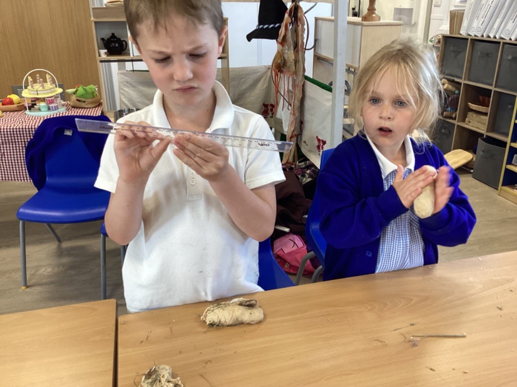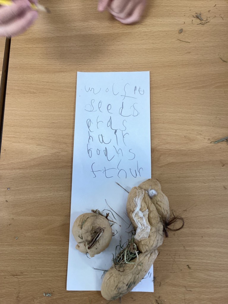 We read up on different types of teeth for different jobs and we found out that different animals have different poo. We set about making some wolf-poo adding bones and teeth and feathers. The Pioneers wrote lists of what may be in the poo and we measured the poo to ensure it was realistic in size.
