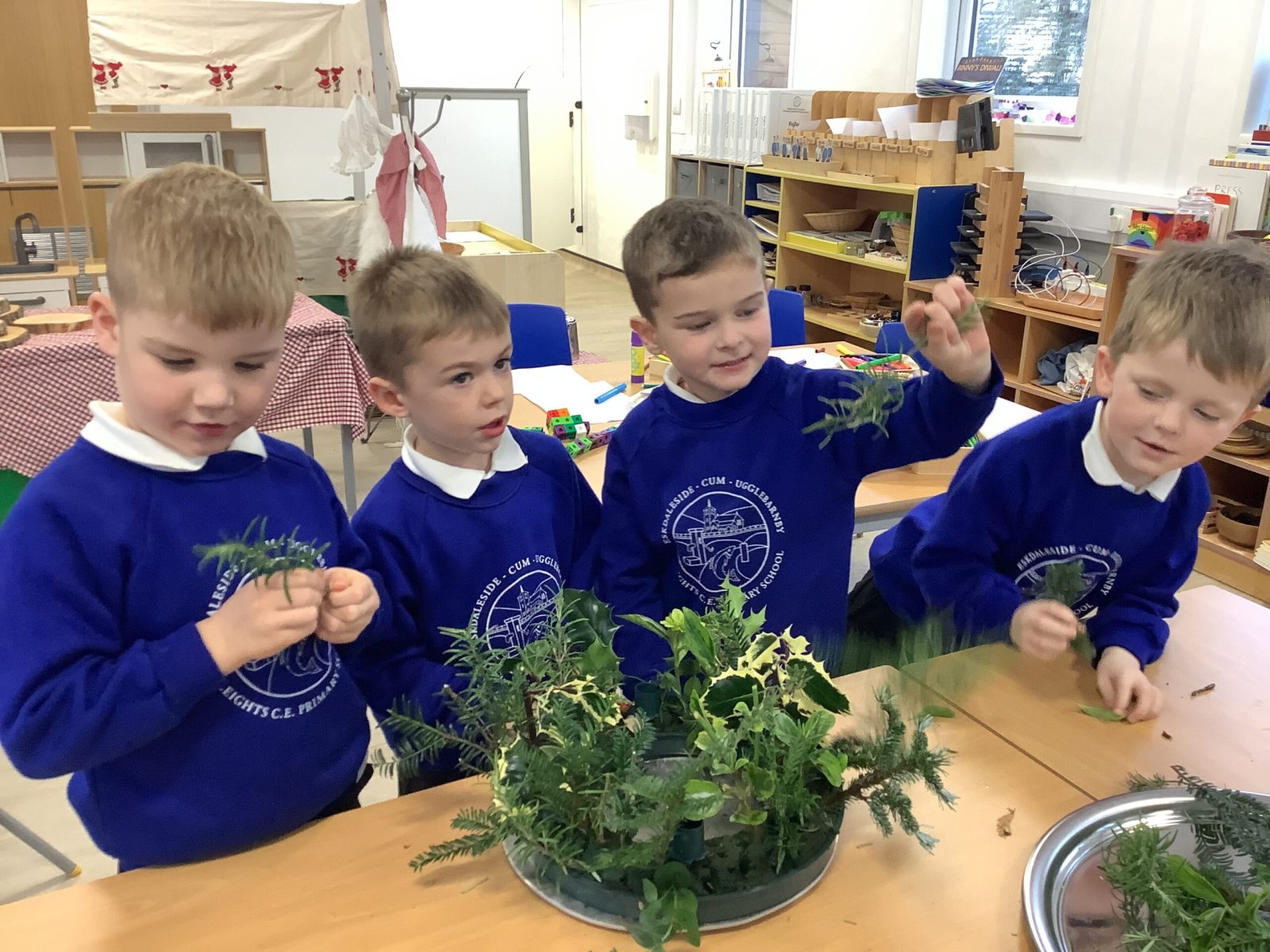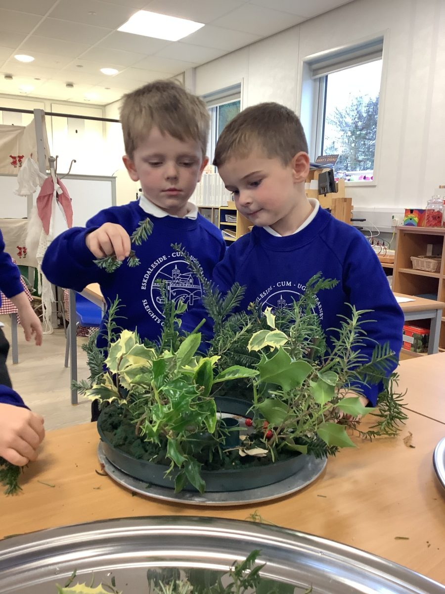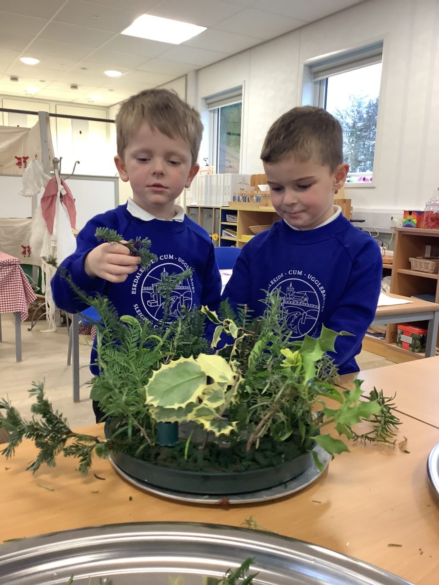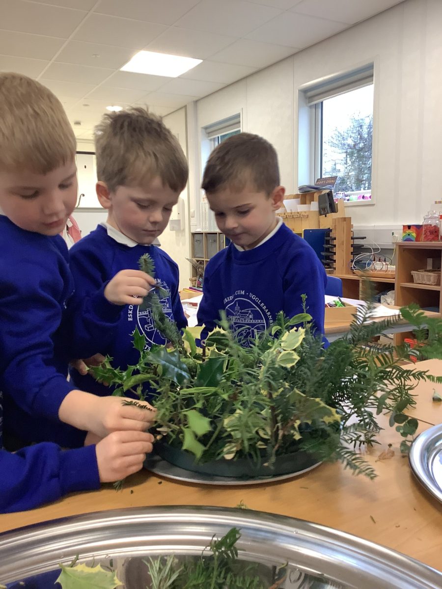 This week the Pioneers discussed their Advent Calendars and we are starting to get a bit excited about Christmas! We looked at our class book,The Path To the Church which details all the events in the Christian Church calendar. We changed the prayer space cloth to purple to reflect the colours seen in church and we will look for these signs of Advent when we visit next week. We then made our own Advent crowns and put in the candles. We discussed the colours and the textures and the hazards of flower arranging.