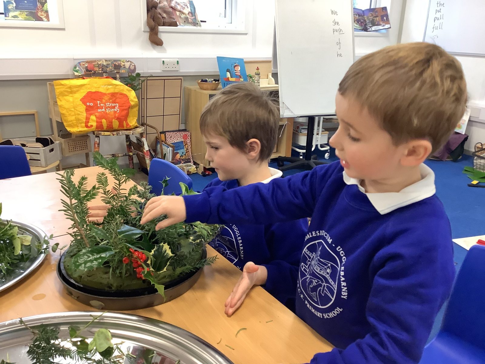 The Elves have left us a note every day to ask for help. They needed a bed and a chair so we made plans and build them joining wood and card. They spilt paint and left red footprints so we had to clear that up and do some pictures. They asked for a “light in the night” so we got out some torches. We also talked about life in the past without electricity and how the Cobbler’s Shop may only have had a candle. We lit the candle and talked about the dangers and how difficult this would be. They also went outside and got stuck in the snow, in the igloo. We had to dig them out. All of the letters they wrote contained some of our current digraphs which was very useful! Great focus and lots of writing.