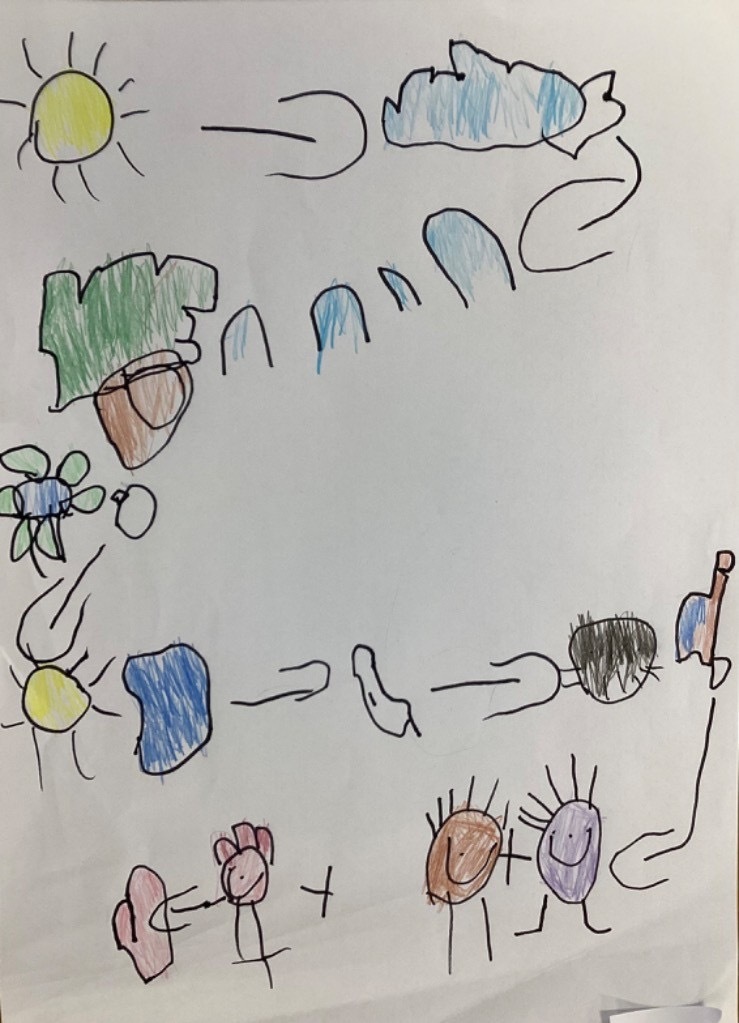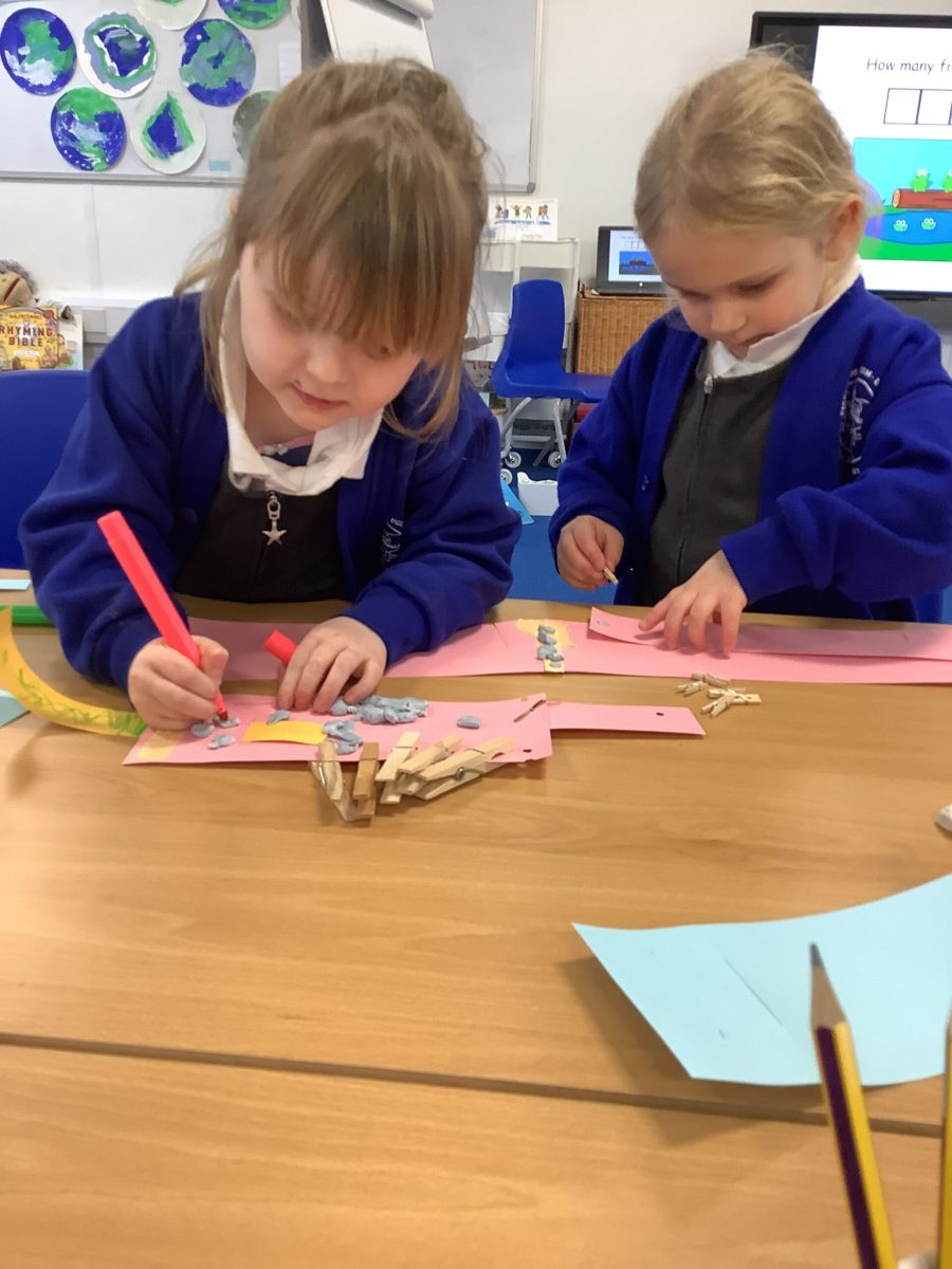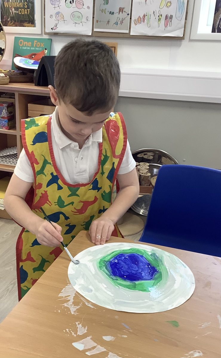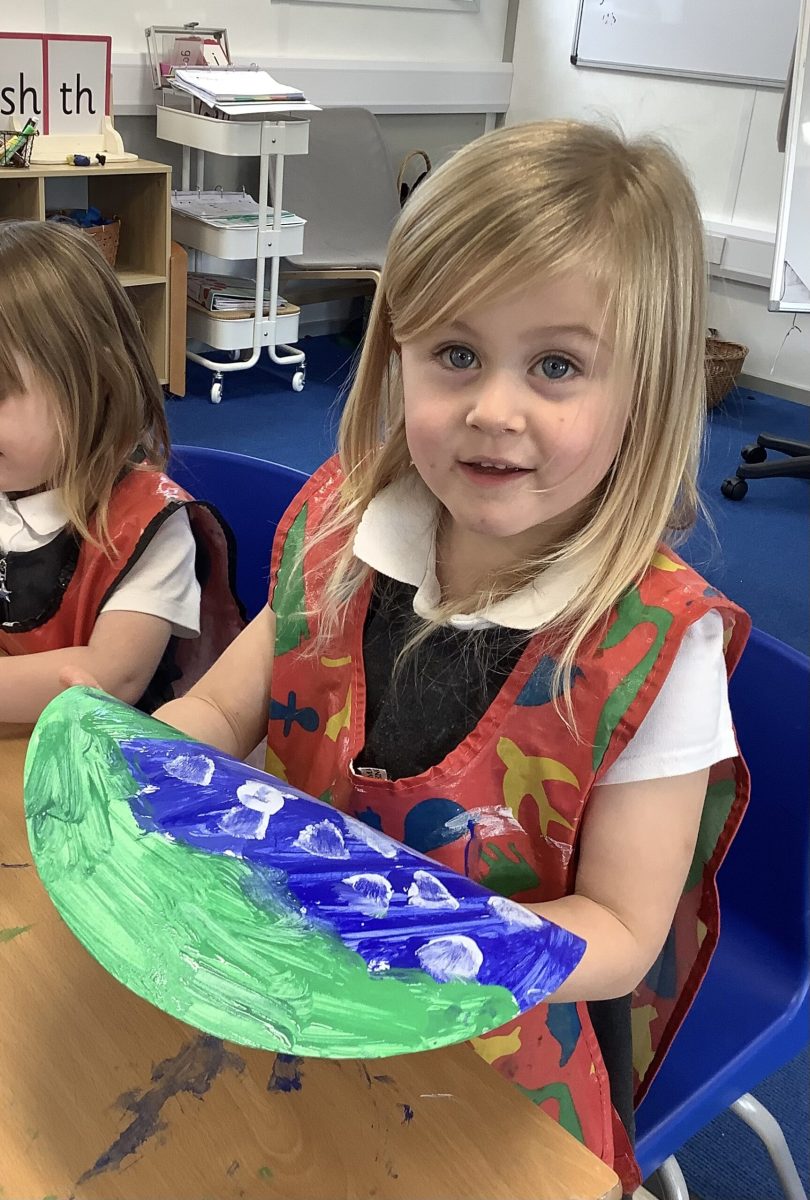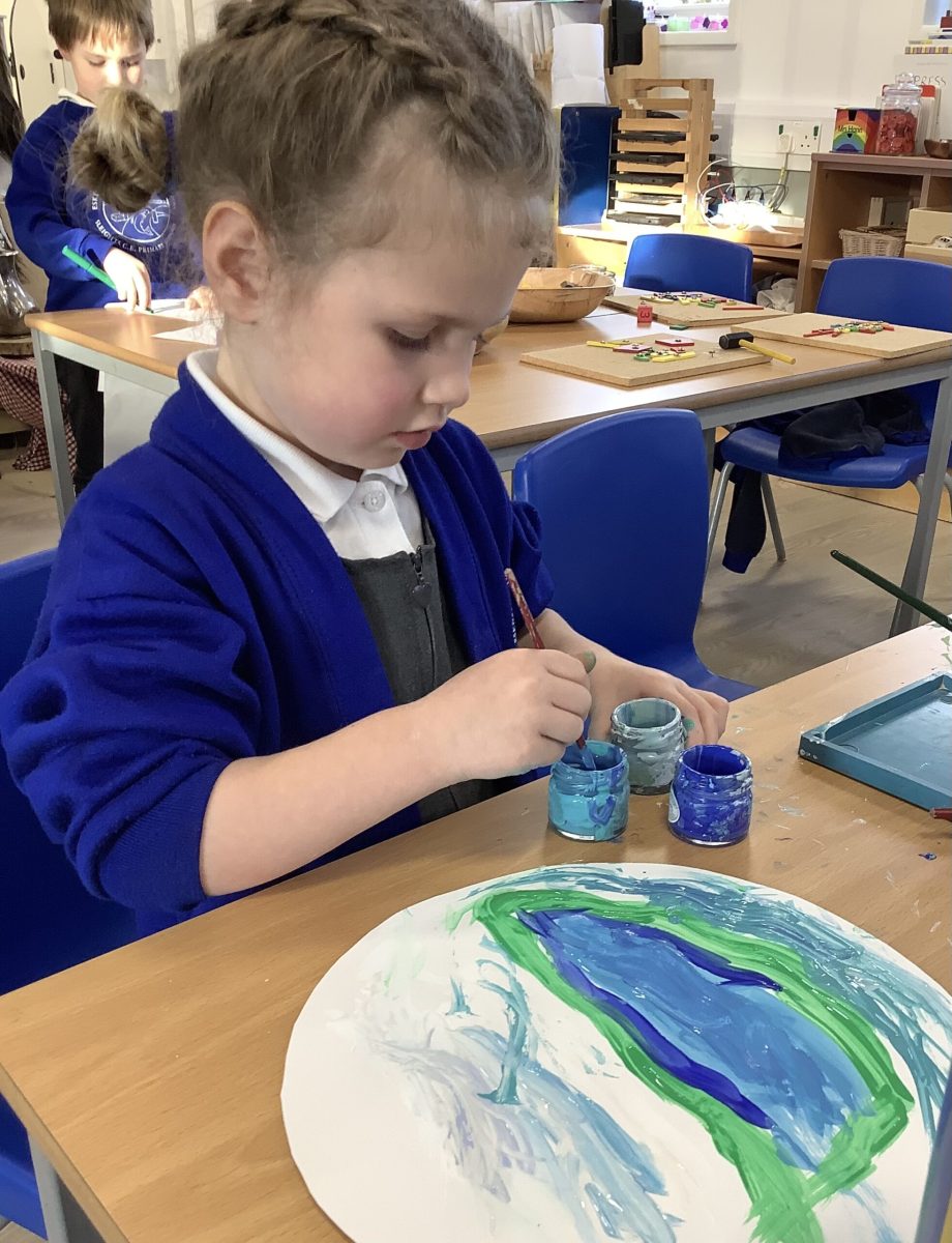We have read the story of the Creation and retold this with a story map. We have looked at our planet on Google Earth and discussed the colours and what we can see. The clouds are very visible. The white is the ice and the snow and the green is the land. The Pioneers also noticed that some of the land is different colours and knew that this was because some places are hot and dry. The Pioneers then recreated what they saw and talked about what they had painted. They enjoyed mixing and naming the colours too.