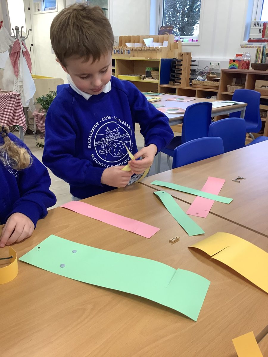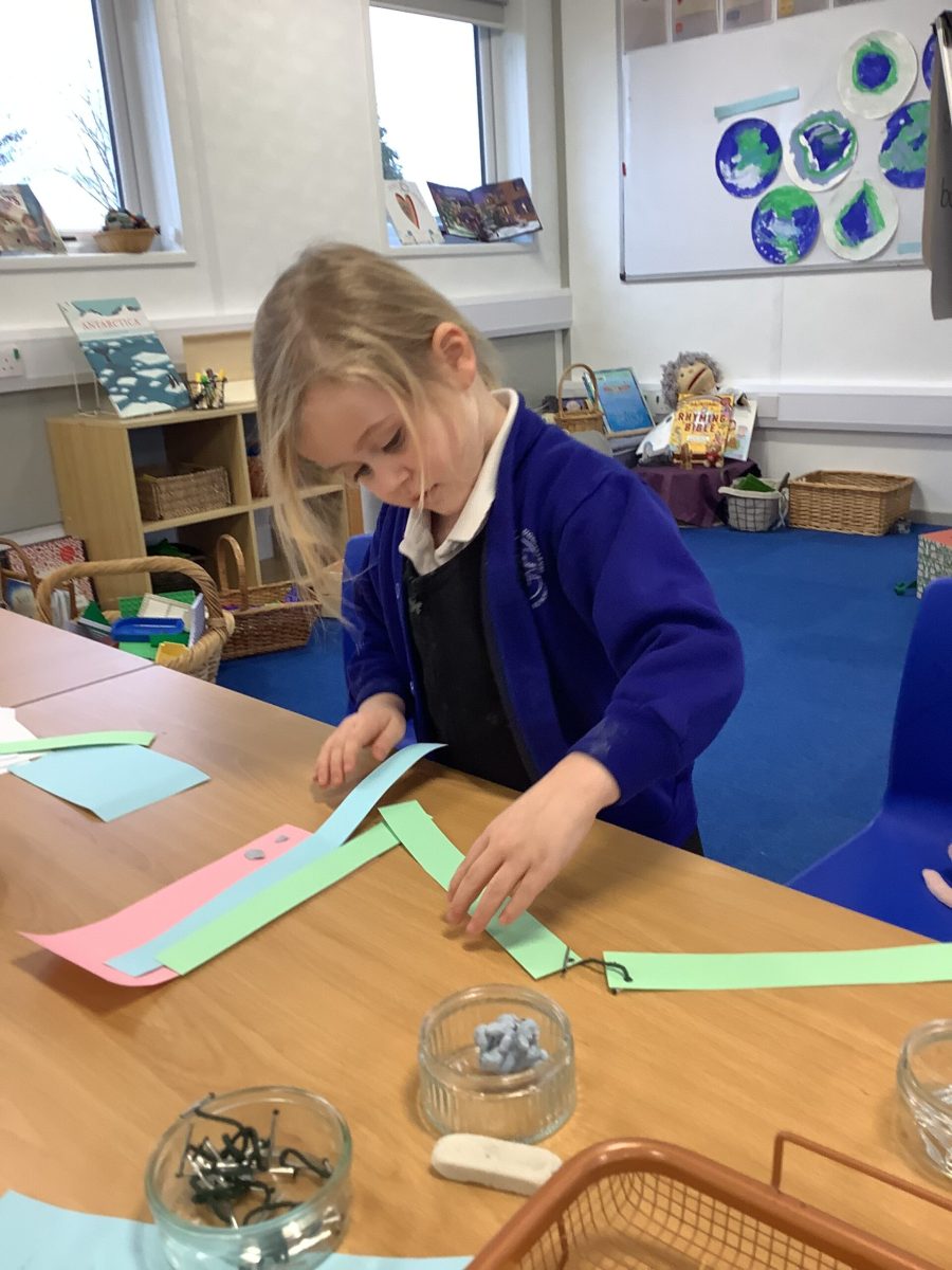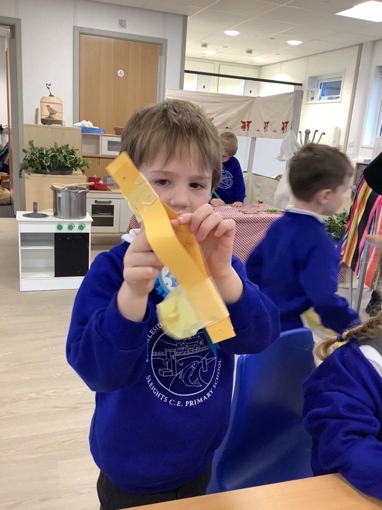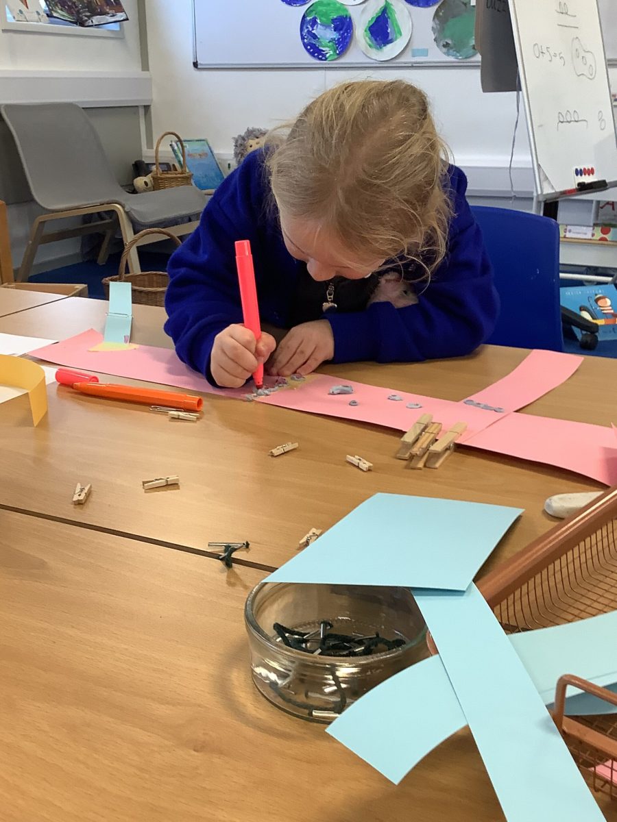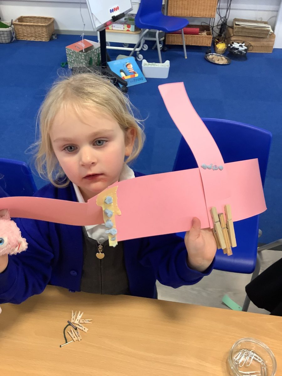 The Pioneers all love cutting and sticking and this week we have added other techniques for joining materials. They have used treasury tags, paper fasteners, paperclips and elastic bands. They tried a bit of weaving the paper and sticking with tape and blutac. They have experimented with cutting slits and tabs to join and have been incredibly focussed and skilled in this. There was not prototype or model to complete and the variety of structures was magnificent. Their creations were used in play during the week. This exploration will continue.