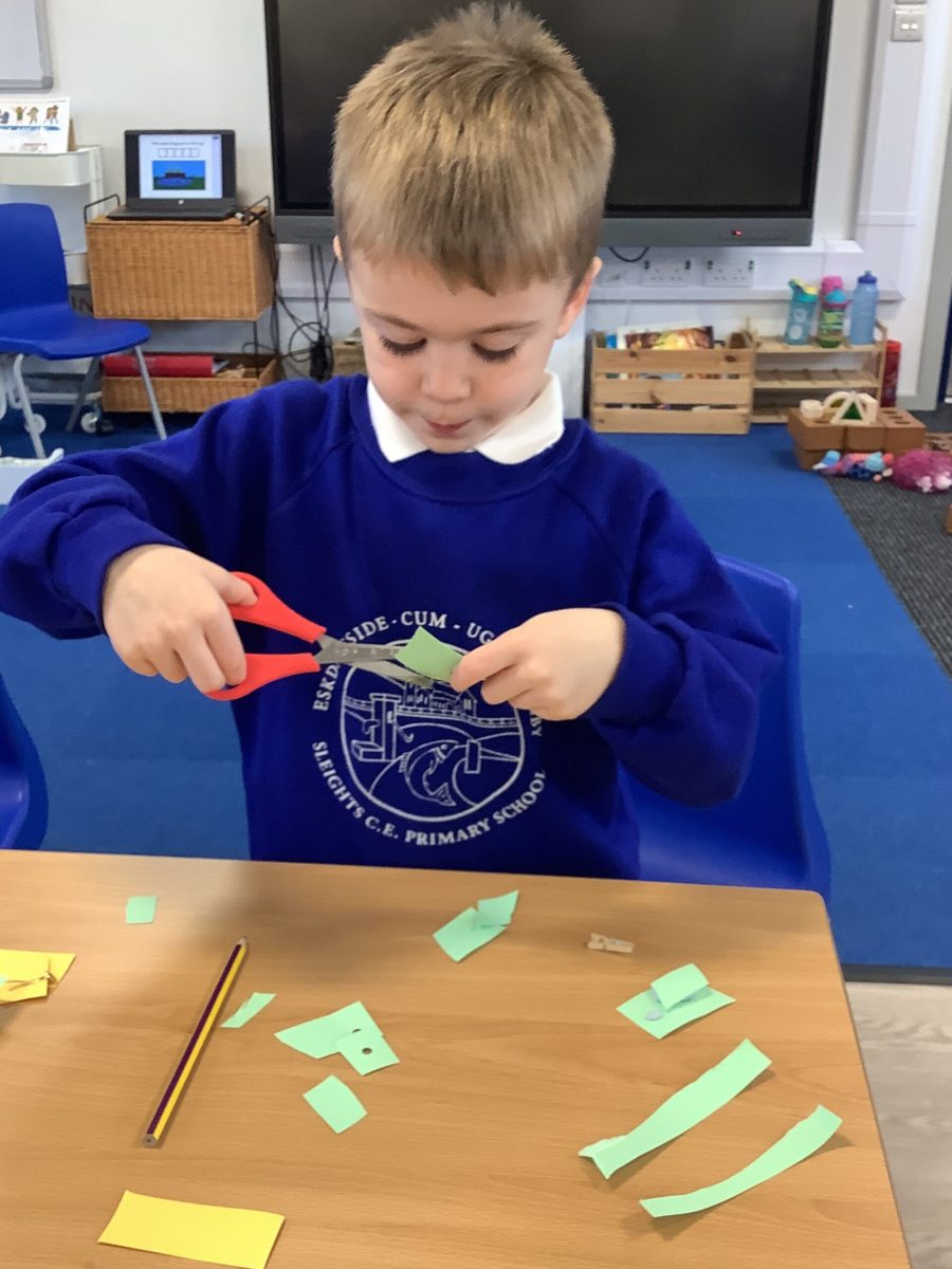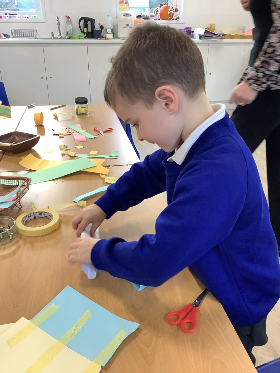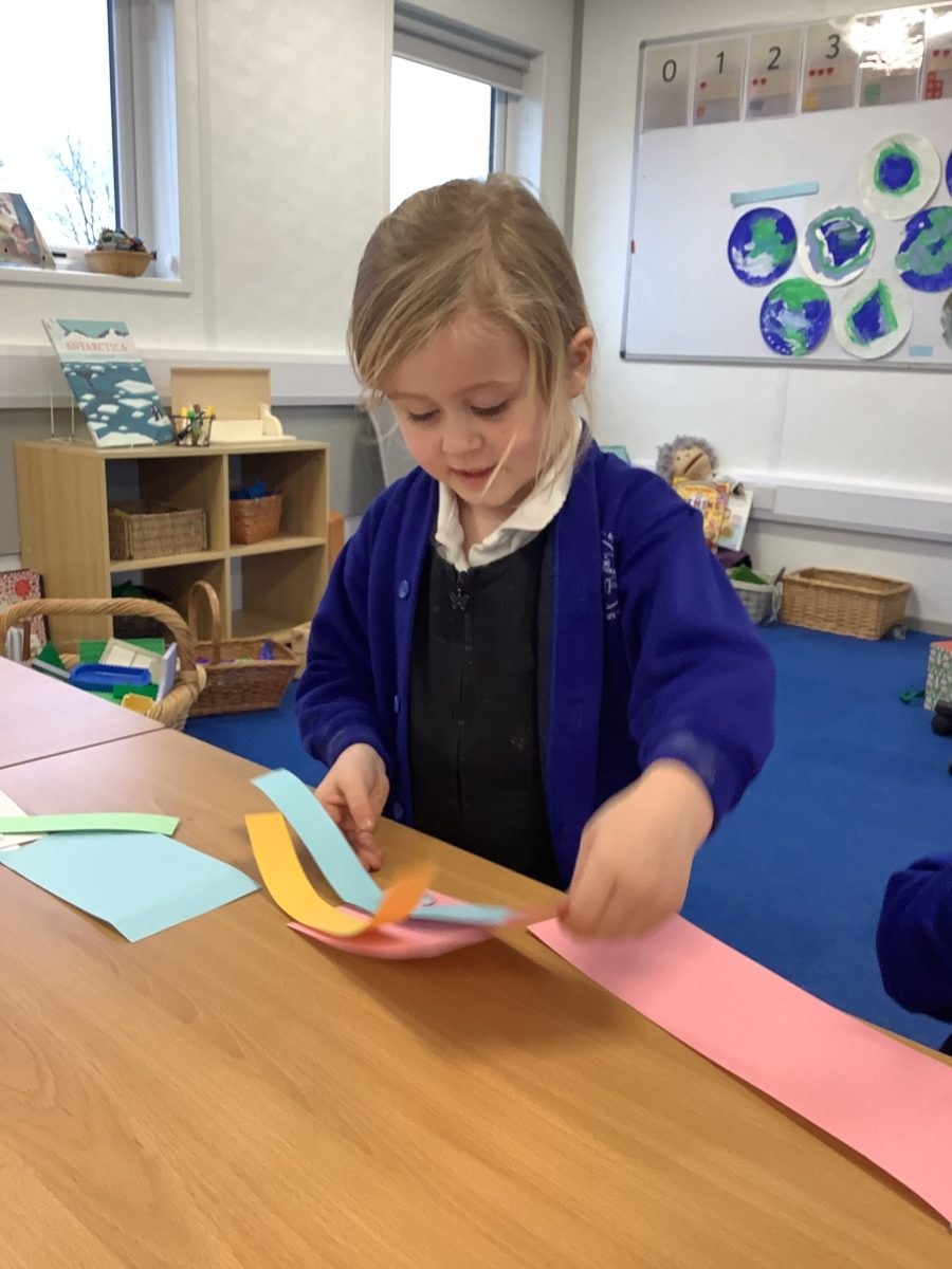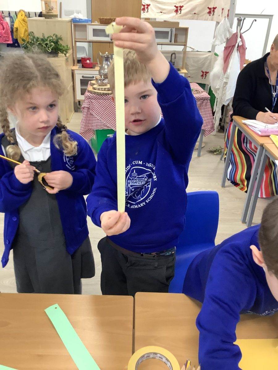 The Pioneers all love cutting and sticking and this week we have added other techniques for joining materials. They have used treasury tags, paper fasteners, paperclips and elastic bands. They tried a bit of weaving the paper and sticking with tape and blutac. They have experimented with cutting slits and tabs to join and have been incredibly focussed and skilled in this. There was not prototype or model to complete and the variety of structures was magnificent. Their creations were used in play during the week. This exploration will continue.