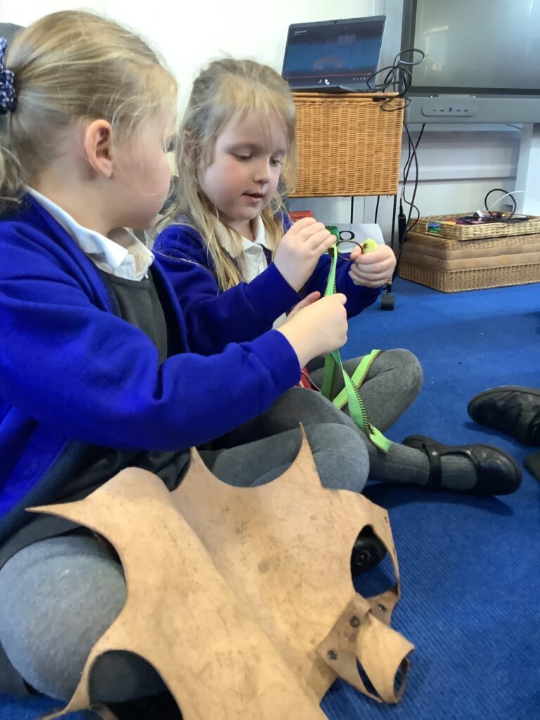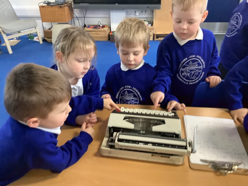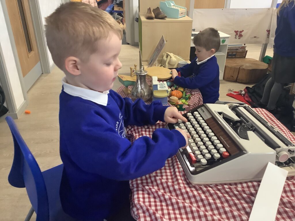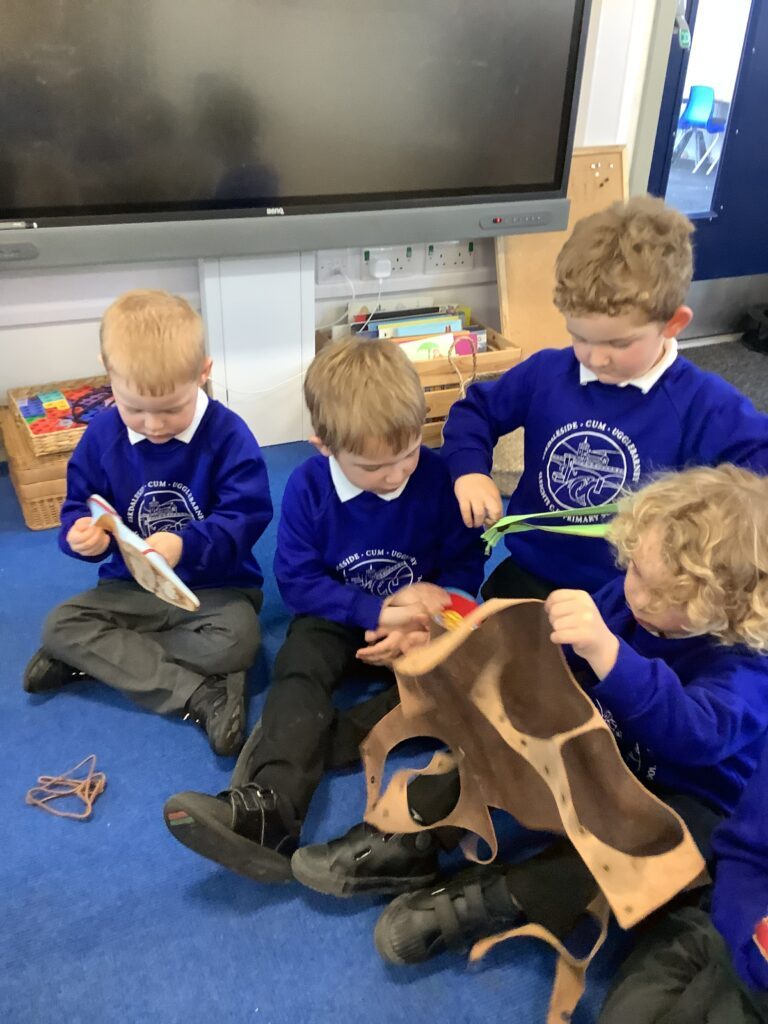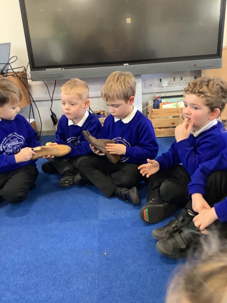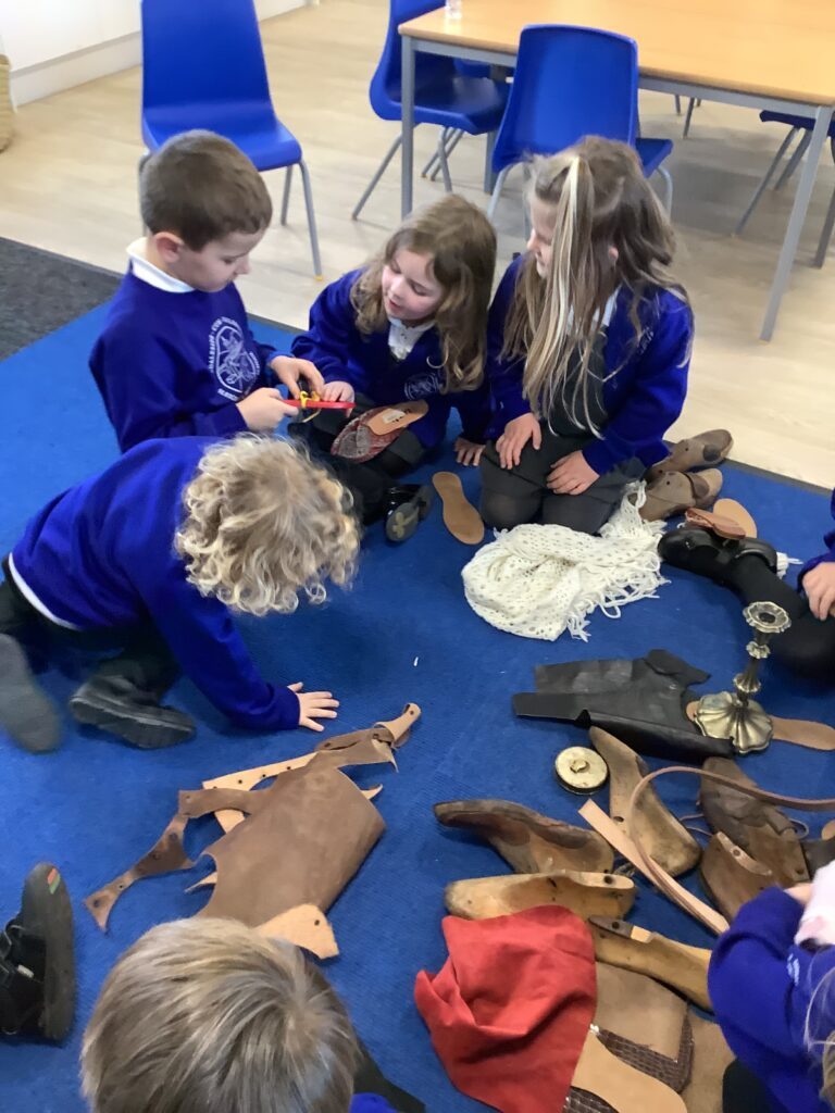 We got together to handle some artefacts belonging to a shoemaker. There were a variety of shoelasts with nobbles and bumps and a selection of soles,laces and zips and collars. We got our hands on a typewriter and an old telephone and discussed how they were so different to the things we use today.